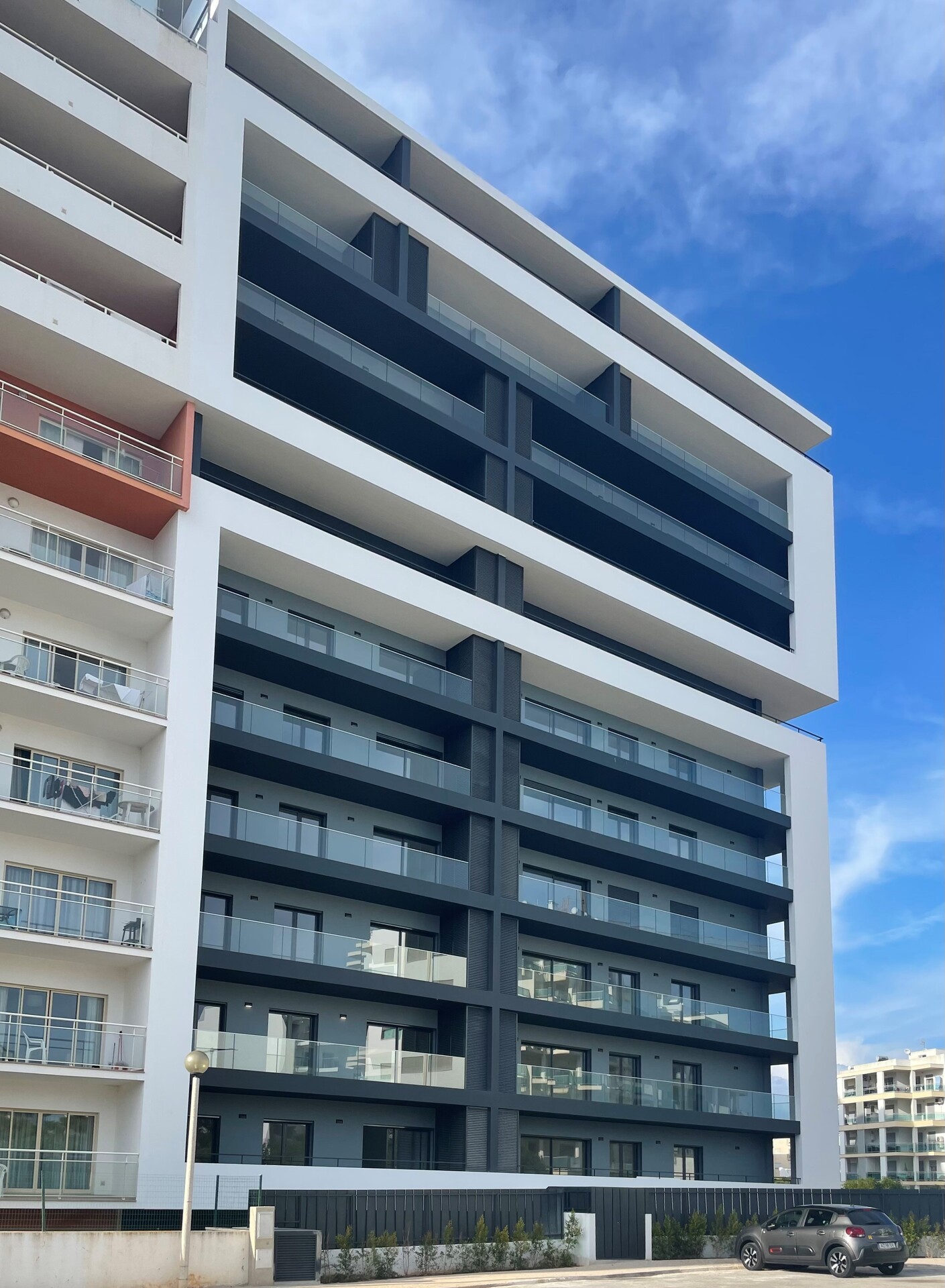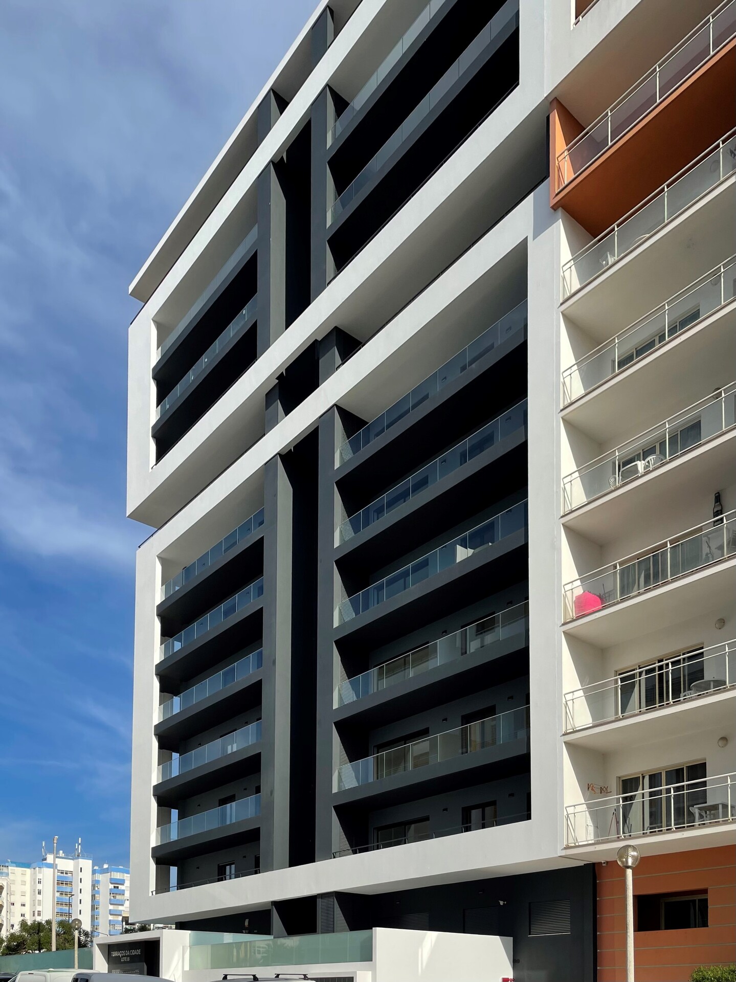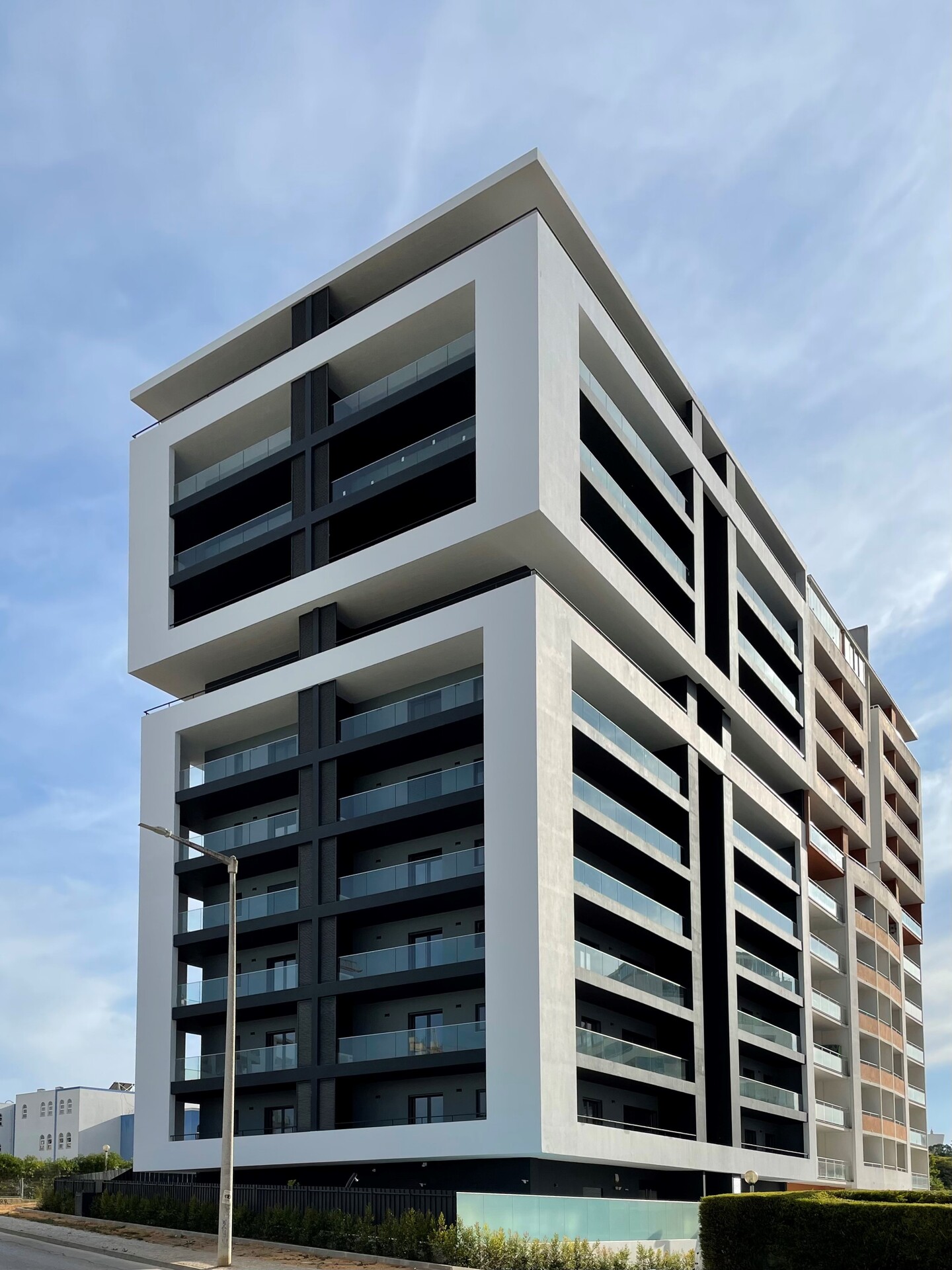 O edifício distingue-se pela estrutura em betão armado, fachadas envidraçadas e amplas varandas que potenciam a luminosidade natural e a eficiência energética.