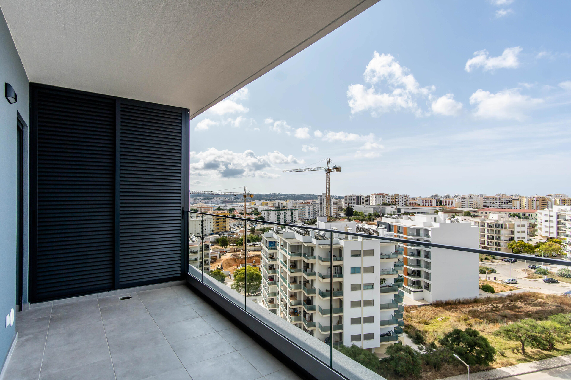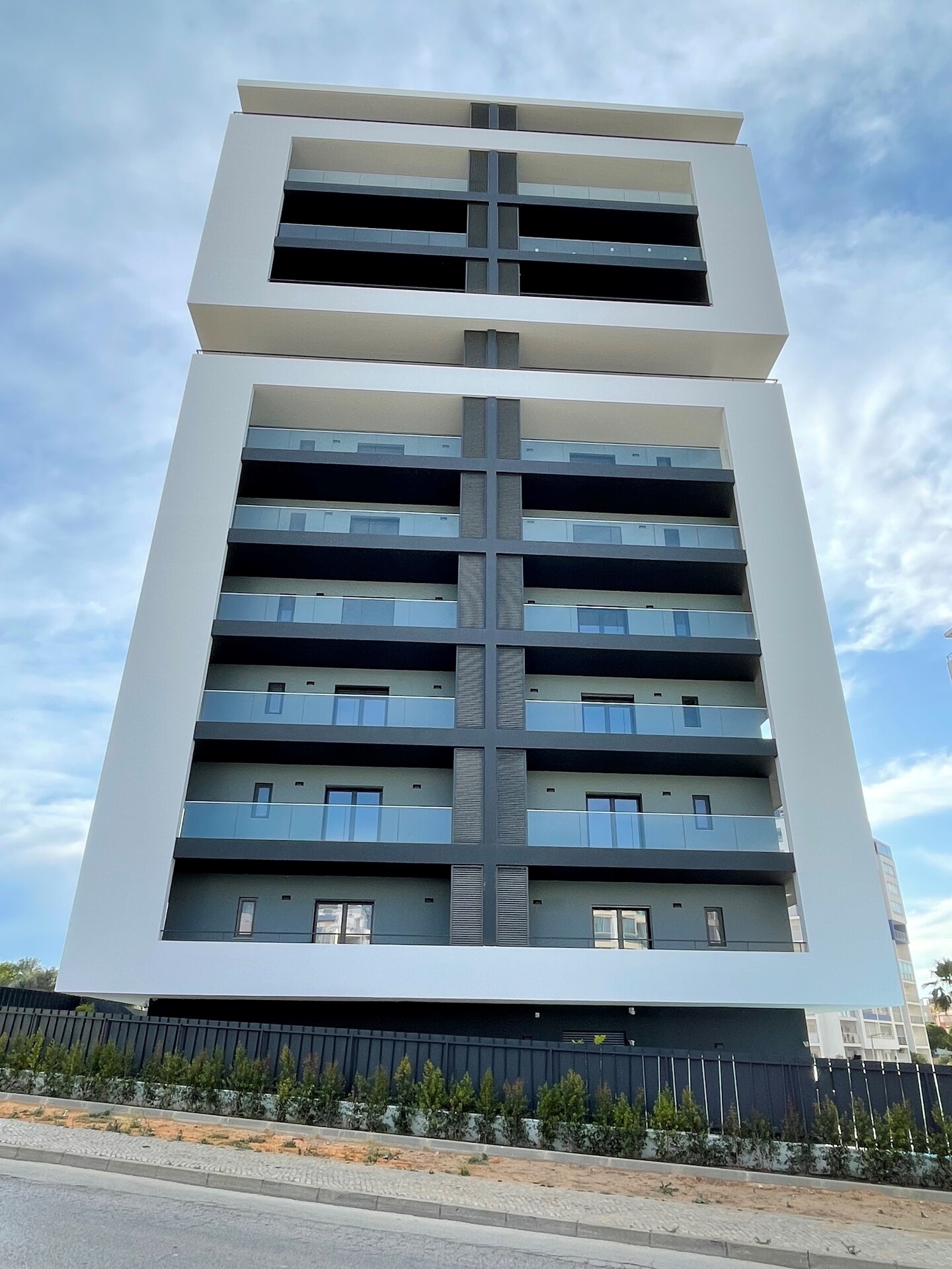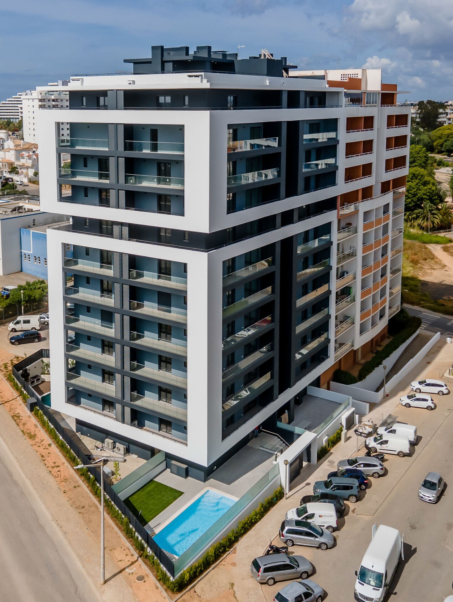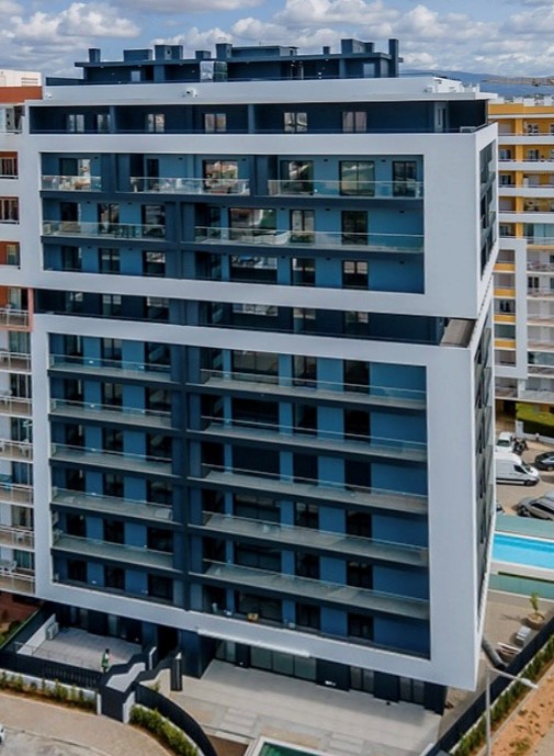 O edifício distingue-se pela estrutura em betão armado, fachadas envidraçadas e amplas varandas que potenciam a luminosidade natural e a eficiência energética.
