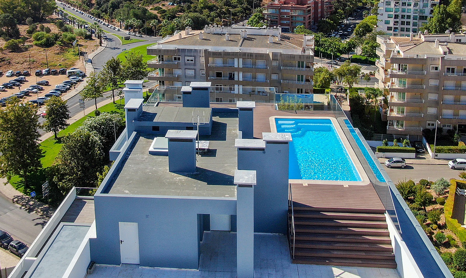 O projeto inclui uma piscina na cobertura, concebida com elevados padrões de segurança e impermeabilização, oferecendo aos residentes uma zona de lazer com vista panorâmica sobre a cidade.